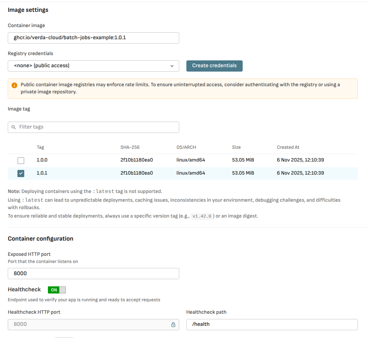 For the container image, we will use the [example app public docker image](https://github.com/orgs/verda-cloud/packages/container/package/batch-jobs-example) `ghcr.io/verda-cloud/batch-jobs-example:1.0.1`