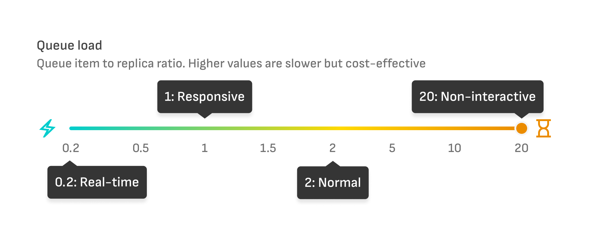 Example: Queue load 2 with 10 replicas means there are 20 messages in queue plus 10 messages in progress before any scaling happens.