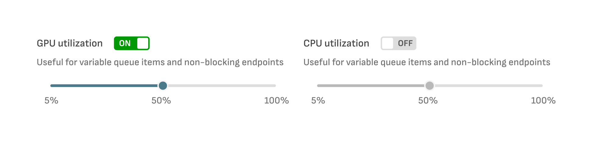 Additional Scaling Metrics currently available are **CPU utilization** and **GPU utilization** (calculated as averages per deployment). In practice, these are not as reliable as queue-based scaling. Depending on the nature of your workload, these may prove useful, for example, when you have known specific CPU-usage pattern for CPU-heavy jobs.
