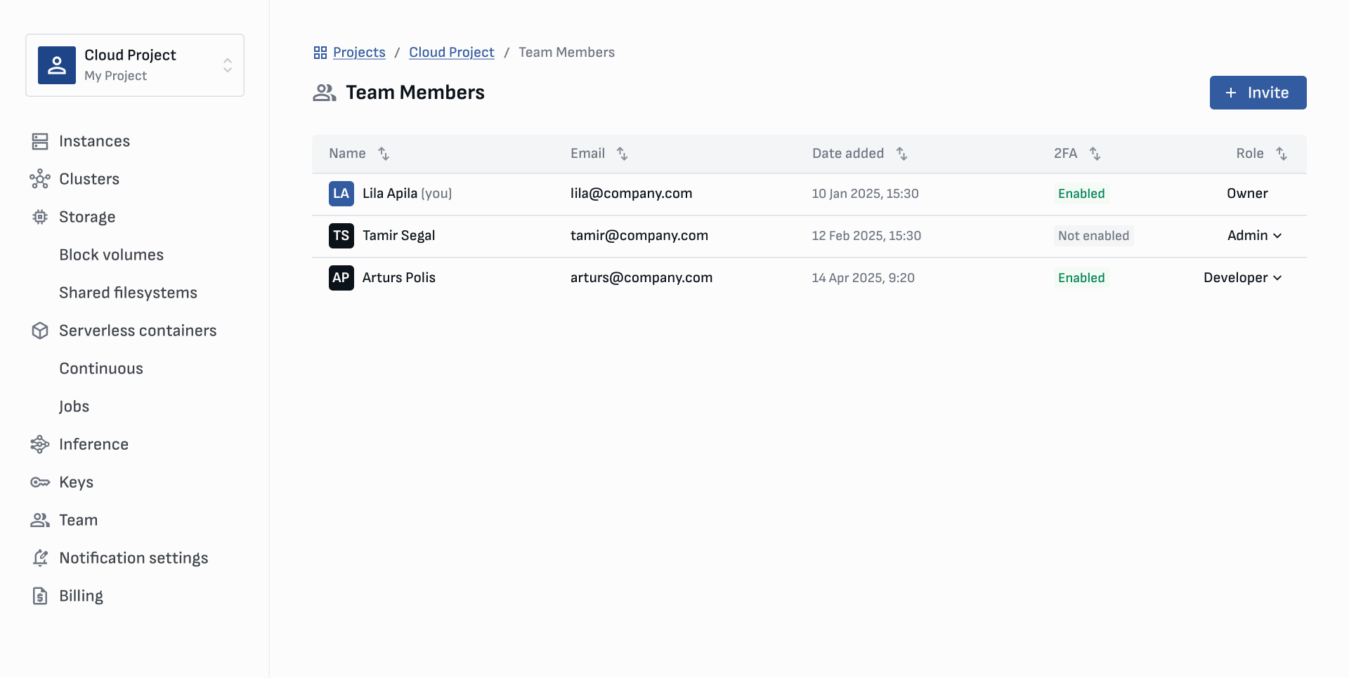 <table><thead><tr><th width="345.19921875">Project Permissions</th><th data-type="checkbox">Owner</th><th data-type="checkbox">Admin</th><th data-type="checkbox">Developer</th></tr></thead><tbody><tr><td>Deploy and manage instances</td><td>true</td><td>true</td><td>true</td></tr><tr><td>Create and manage volumes</td><td>true</td><td>true</td><td>true</td></tr><tr><td>View auto top-up settings</td><td>true</td><td>true</td><td>true</td></tr><tr><td>View balance, currency, usage rate, remaining time</td><td>true</td><td>true</td><td>true</td></tr><tr><td>Edit auto top-up settings</td><td>true</td><td>true</td><td>false</td></tr><tr><td>Top-up project balance</td><td>true</td><td>true</td><td>false</td></tr><tr><td>View billing details (name, address, VAT)</td><td>true</td><td>true</td><td>false</td></tr><tr><td>Invite team members</td><td>true</td><td>true</td><td>false</td></tr><tr><td>Change team member roles</td><td>true</td><td>true</td><td>false</td></tr><tr><td>Transfer resources between projects</td><td>true</td><td>true</td><td>false</td></tr><tr><td>Rename project</td><td>true</td><td>true</td><td>false</td></tr><tr><td>Change default payment card</td><td>true</td><td>true</td><td>false</td></tr><tr><td>Edit billing details</td><td>true</td><td>false</td><td>false</td></tr><tr><td>Add/delete payment card</td><td>true</td><td>false</td><td>false</td></tr><tr><td>Transfer funds between projects</td><td>true</td><td>false</td><td>false</td></tr><tr><td>Delete project</td><td>true</td><td>false</td><td>false</td></tr></tbody></table>