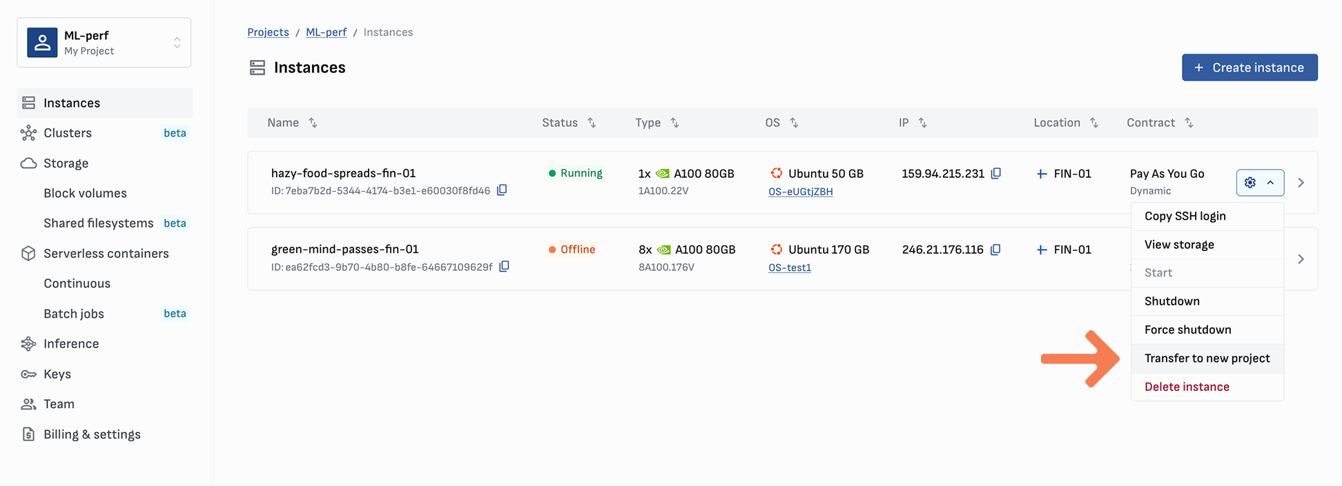 You can find **Transfer to new project** in the Actions menu on the compute cards or in their specific pages. Compute can remain running during the transfer. There is no need to shutdown instances, unless you want to detach storage first.