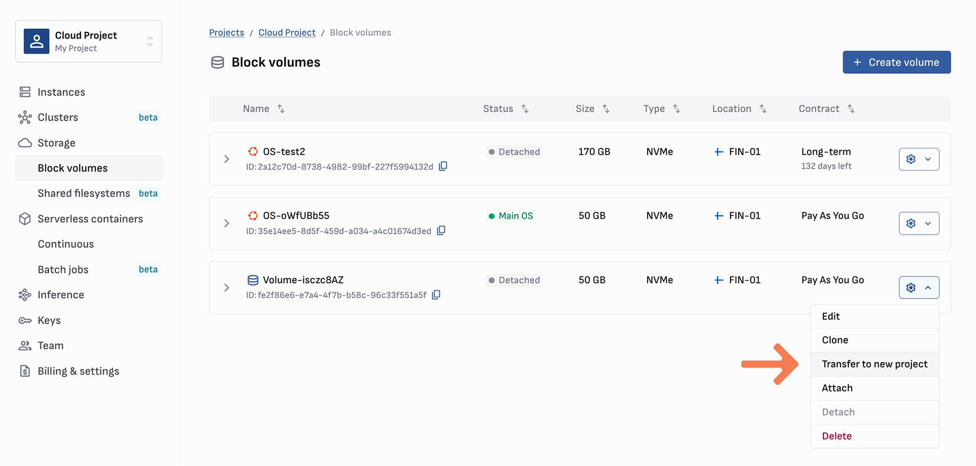 On the **Block volumes** screen, open the settings menu of the volume you would like to transfer. Click on **Transfer**, select the target project, and click **Transfer volume**.
